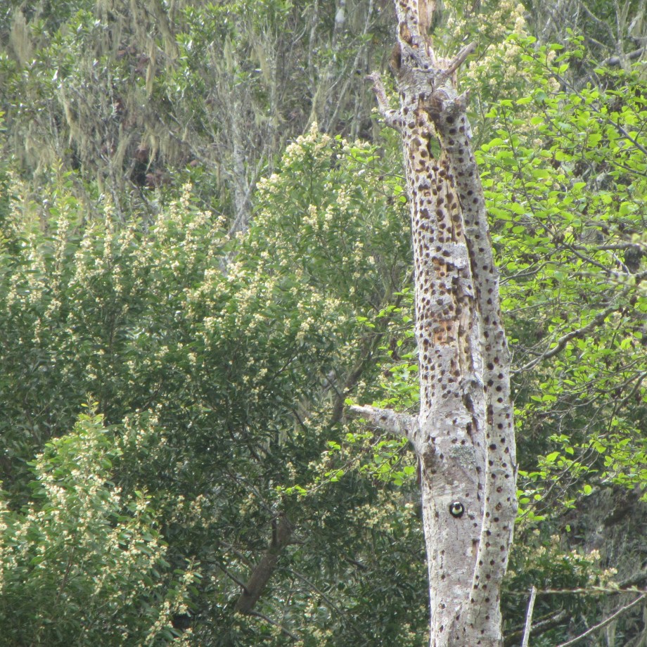 Acorn granary with resident Acorn Woodpecker